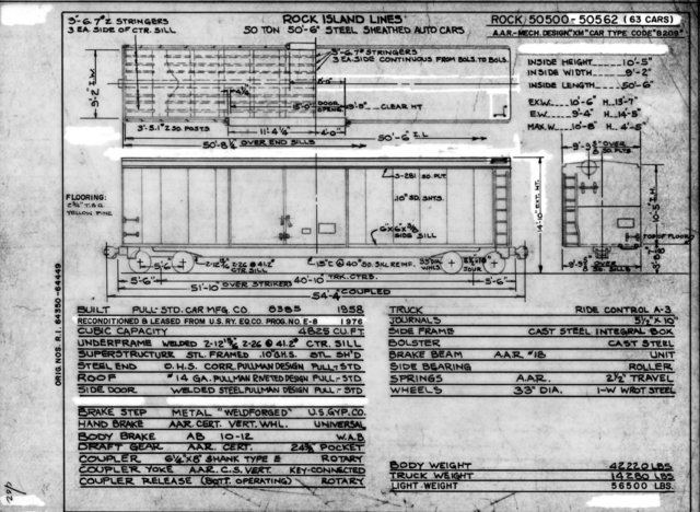 [Kind-of like a Superior door, but with a "crease" down the middle of each panel]Brake Step Metal "Weldforged"; U.S. Gyp. Co. Hand Brake A.A.R. Cert. Vert. Whl.; Universal Body Brake AB 10-12; W.A.B. Draft Gear A.A.R. Cert. 24⅝" pocket Coupler 6¼" x 8" Shank Type E; Rotary Coupler Yoke A.A.R. C.S. Vert; Key-connected Coupler Release (Bott. Opening) Rotary Body Weight 42220 lbs Truck Weight 14280 lbs Lt Weight 56500 lbs Truck Info Trucks Ride Control A-3 Journals 5½" x 10" Side Frame Cast Steel Integral Box Bolster Cast Steel Brake Beam A.A.R. #18; Unit Side Bearings Roller Springs A.A.R. 2½" travel Wheels 33" dia; 1-W Wrot Steel